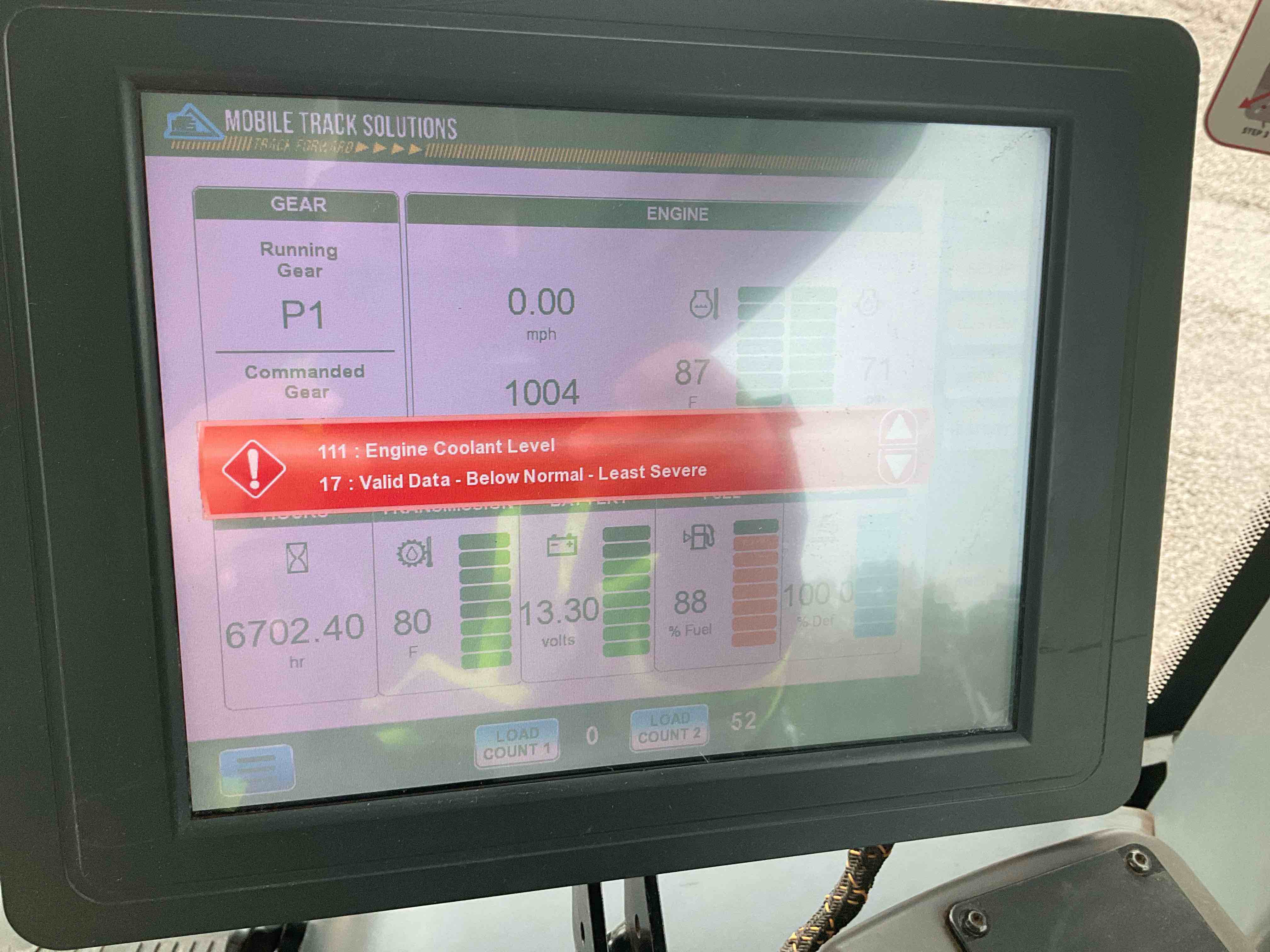 Coolant low. Fault code for low coolant is shutting mwchine down after 2 minutes of operation,